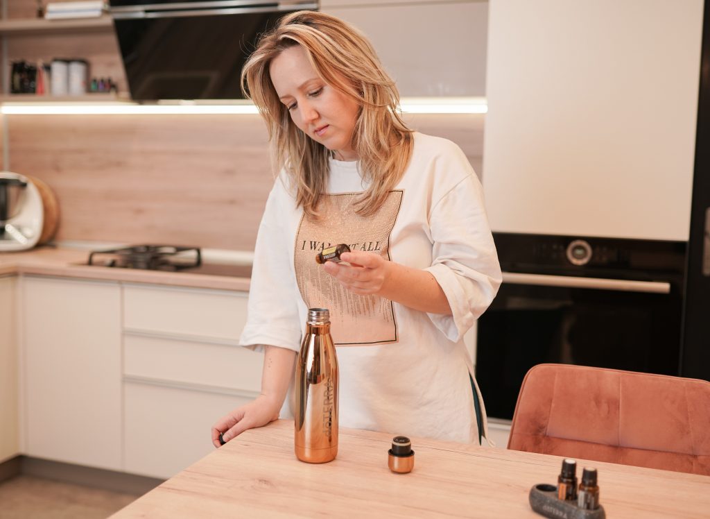 Dimineața, de exemplu, pun 3 picături de Spearmint pe podeaua de la duș, Bergamot Mint în gelul de duș. În timp ce îmi fac planul pentru ziua care urmează, masez tălpile cu Balance și îmi pun în apă 2 picături de Lemon. Seara pun în difuzorul din dormitor Lavender și Air, nu înainte de a pulveriza Serenity pe așternuturi.